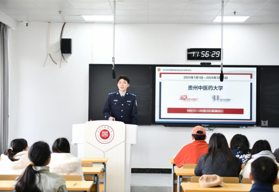 为切实提升全校学子反诈意识和自我防护能力,筑牢校园安全防护屏障,3 月 24 日,贵州中医药大学联合贵阳市公安局反诈中心、贵安新区公安局,成功举办 “百警进班・守护青春” 主题反诈宣传活动。活动以 “小班面对面、宣讲全覆盖” 的创新模式,为全校 1.9 万余名学子送上精准化、实用性强的反诈知识,有效守护了学生群体财产安全,营造了安全和谐的校园氛围。